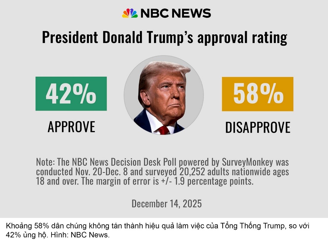 Phần lớn người trưởng thành ở Mỹ không tán thành hiệu quả công việc của ông Trump, với tỷ lệ ủng hộ là 42% và tỷ lệ không tán thành là 58% trong cuộc thăm dò mới nhất. Đó là sự sụt giảm nhẹ 3 điểm phần trăm (từ 45% và 55%) so với bốn cuộc thăm dò được thực hiện kể từ tháng Tư, thời điểm cuộc khảo sát đầu tiên được tiến hành. Cuộc thăm dò mới này đã khảo sát 20,252 người trưởng thành trực tuyến, bao gồm cả những người đã đăng ký bỏ phiếu và chưa đăng ký bỏ phiếu, từ ngày 20 tháng 11 đến ngày 8 tháng 12, với sai số cộng hoặc trừ 1.9 điểm phần trăm.